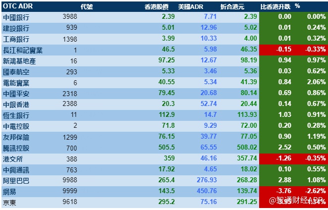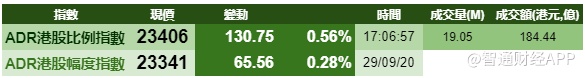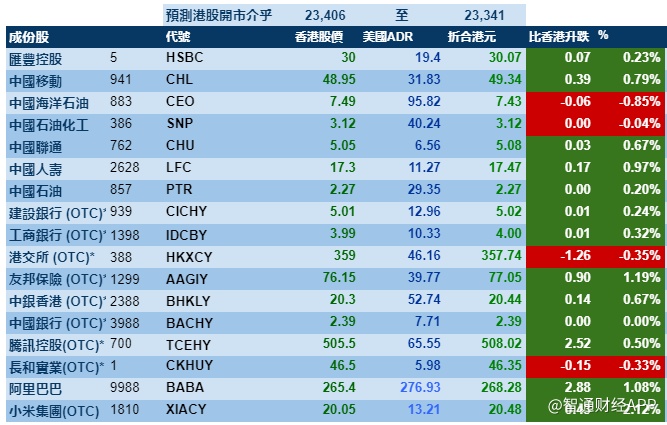 智通财经APP获悉,周二美股三大指数小幅下跌,但港股ADR指数小幅上涨,按比例计算,收报23406点,涨130.75点或0.56%。