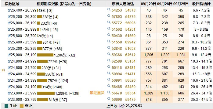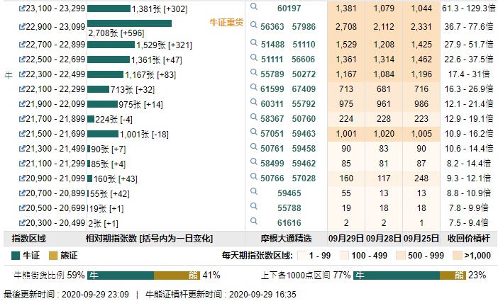 智通财经APP获悉,截至9月29日,恒指最新的牛熊街货比例59:41。摩根恒指牛熊证街货分布图中的数据显示,熊证街货重货区在23800-23999区间,该区间最新熊证数量为1289张,较上一交易日增加139张;最多新增也在此区间。牛证街货重货区在22900-23099区间,该区间最新牛证数量为2708张,较上一交易日增加596张;最多新增也在此区间。