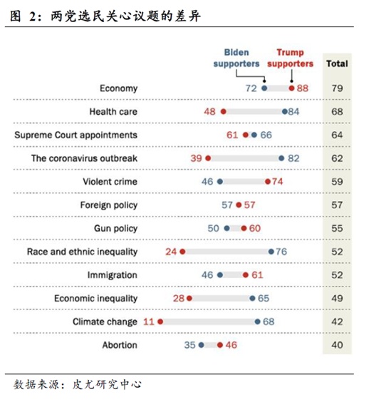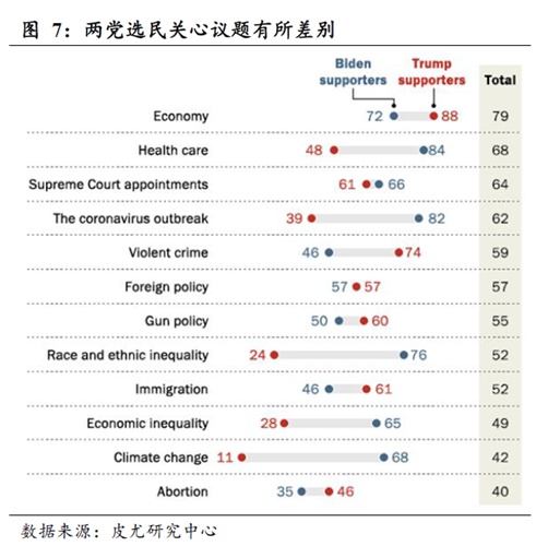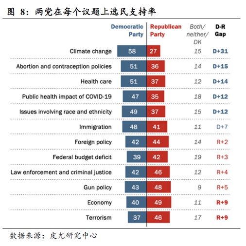 民主党在种族平等方面大幅领先共和党,而共和党则在反对暴力方面小幅领先民主党。两人将继续稳定自己的选民基本盘,拜登将把特朗普塑造成一个“种族主义者”,而特朗普则会把拜登塑造成一个“暴乱制造者”。根据皮尤研究中心民调数据(图8),在种族平等议题上民主党领先了共和党12%,这与民主党一贯地重视少数族裔问题有关。而在反对暴力犯罪、加强执法方面,共和党则小幅领先了民主党4%。