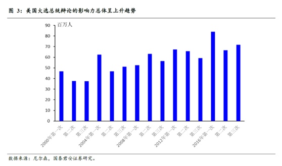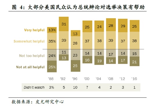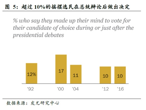 从历史数据来看,首次总统辩论将会吸引大批选民,尤其是摇摆选民的“观战”,虽然过半选民认为总统辩论对选举决策有帮助,但从历次辩论结果来看,总统辩论影响极为有限。根据美国媒体调查机构尼尔森的统计数据,2000年以来美国总统大选辩论的收看人数总体上呈上升趋势,并且首次辩论一般也将会吸引更多观众(图3),本次总统辩论预计也将会吸引大批选民,尤其是摇摆选民的“观战”。根据皮尤研究中心历史民调数据显示,大部分美国民众依旧认为总统辩论对他们做出决定是有帮助的(图4),并且一般都会有超过10%的民众是在总统辩论后决定自己支持哪位候选人的(图5)。但从历次辩论结果来看,总统辩论影响极为有限。