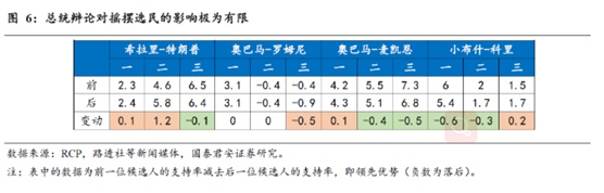 总统辩论对摇摆选民的影响极为有限。从以往总统辩论的数据来看,候选人的领先优势在辩论前后有涨有跌,且变动幅度较小。只要拜登不犯“低级错误”,拜登仍可继续保持领先优势。美国2004年以来共举行了四次总统大选共12场总统辩论(图6),从最终候选人的领先优势来看,有5次辩论后候选人领先优势扩大,有5次领先优势缩小,还有两次保持不变。但变动幅度都较小,仅有一次变动幅度超过了1%,平均而言变动标准差仅为0.34%,总统辩论前后选民支持率变化并不大,总统辩论对摇摆选民的影响极为有限。本次总统辩论中,只要拜登不犯“低级错误”,拜登仍可继续保持领先优势。