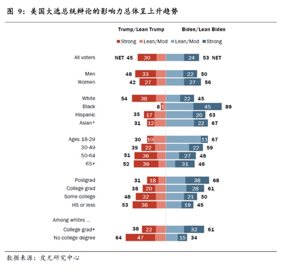 两人辩论的基本策略——稳定基本盘,提高投票率,争取摇摆选民。两党都有各自的选民基本盘,在大选投票率很低的情况下,两党的首先任务是激励自己的基本盘选民去投票支持自己,而非去挖对方墙脚,不然可能墙脚没挖成,反倒使得自己基本盘选民流失。同时摇摆选民也是候选人取胜的关键,候选人还会在稳住自己选民基本盘后向摇摆选民倾斜,这一点也使得两党在部分主张上走向趋同。具体而言,特朗普的选民基本盘的特点是白人男性、年龄较大、受教育程度较低,而拜登的选民基本盘则基本与之相反(图9)。