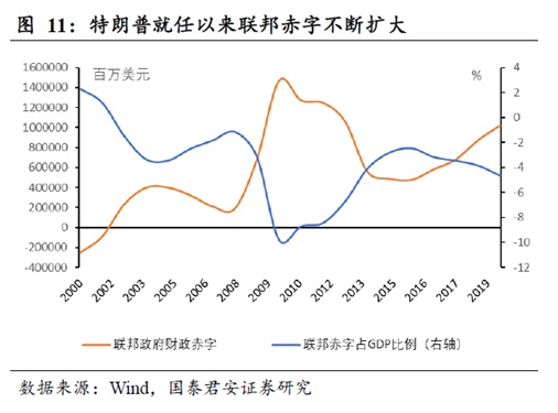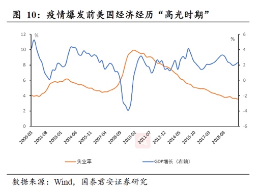 卫生事件爆发前美国经济的繁荣景象或将成为特朗普辩论中鼓吹的重点,而财政赤字和贫富差距的扩大或将成为拜登攻击特朗普的靶点。在2017年特朗普上任后,通过减税改革等刺激措施,再加上经济复苏周期,在卫生事件爆发前美国经济确实经历一段时间的“高光时期”,GDP季度增速一度高达3.33%,失业率甚至下降到了40年以来的新低(图10)。但税改在短期内刺激经济增长的同时,也使得联邦赤字不断扩大,贫富差距不断扩大,成为美国经济长期发展的阻碍。