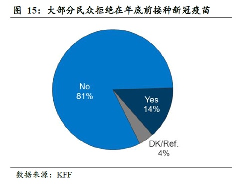 特朗普在卫生事件应对方面公信力丧失,年底前甚至大选前推出疫苗更是“空头支票”,是特朗普在该议题落后拜登的主要原因,特朗普将在该议题上竭力“甩锅”给中国。特朗普在卫生事件爆发时曾多次发表误导性言论、打压对卫生事件的检测、排挤福奇等专家,使得特朗普在卫生事件应对方面公信力丧失,超过60%的人选择不相信特朗普(图14)。而特朗普在竞选纲领中还承诺将在今年年底前研发出疫苗,并且将在2021年将整个国家恢复到正常状态,但其对疫苗研发中心的催促也使得民众对疫苗的可靠性产生怀疑,绝大部分选民并不敢贸然接种(图15)。特朗普应对卫生事件不力将会成为拜登攻击的核心之一,特朗普也将会竭力“甩锅”给中国。