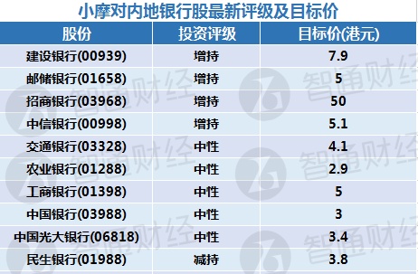 小摩建议增持的四只内银股分别为建设银行(00939)、邮储银行(01658)、招商银行、中信银行(00998),目标价分别为7.9、5、50、5.1港元。