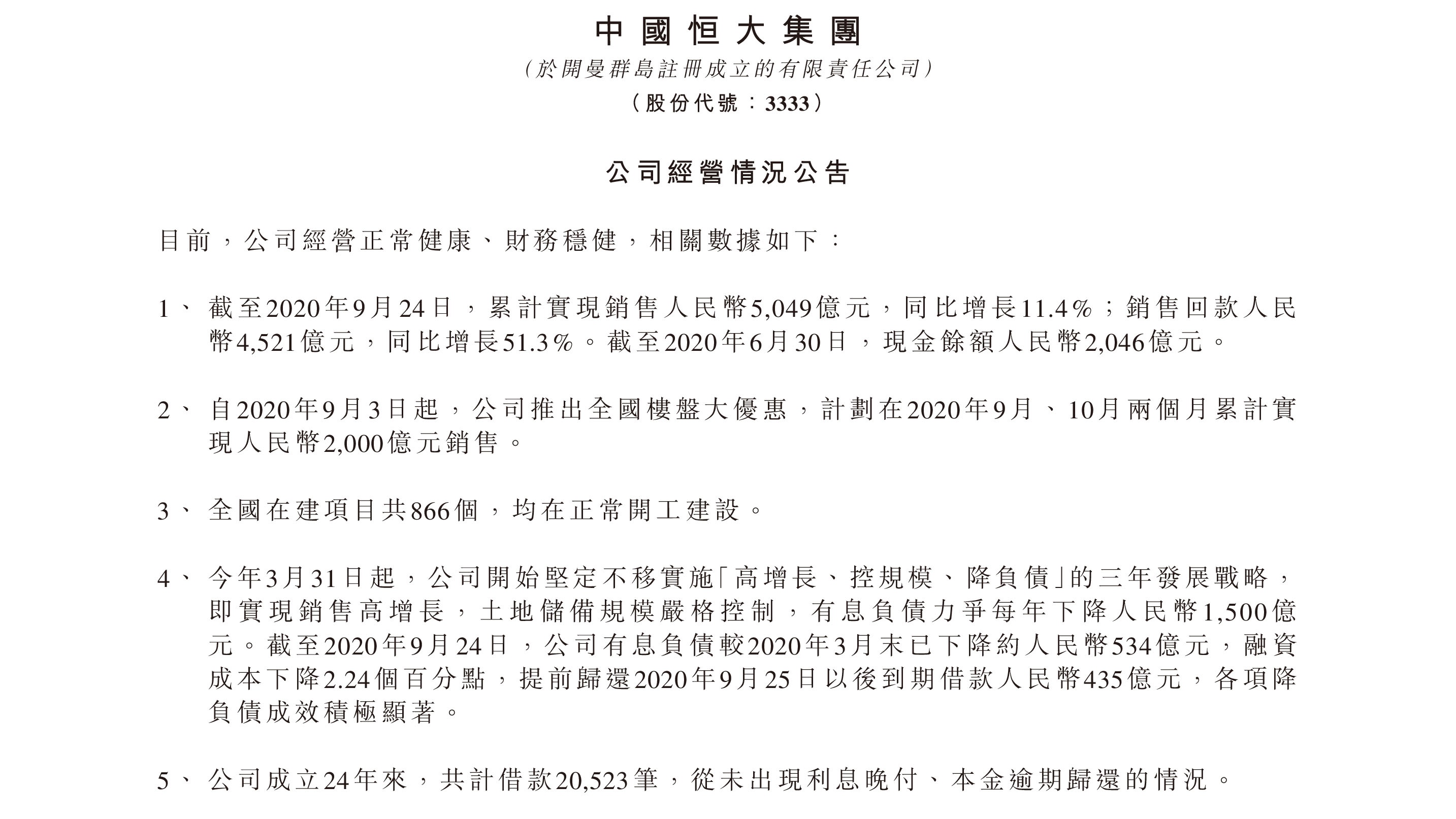 谣言后,公司股价如预期反弹,除对资金谣言直面回击外,与恒大自身强大的“硬实力”密不可分。9月25日晚,恒大则发布公告公布公司最新经营情况,用实打实的数据再度强势回应谣言,从五大方面亮出了殷实“家底”: