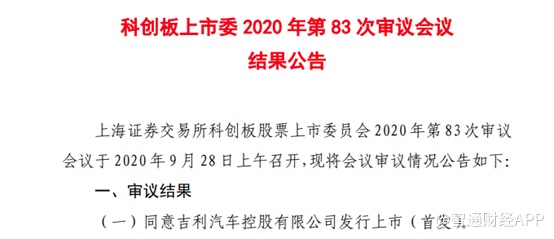 9月28日,吉利汽车(00175)发布公告,科创板股票上市委员会2020年第83次审议会议召开,根据会议审议结果,根据特别授权进行建议人民币股份发行已获科创板股票上市委员会批准。这意味着,“科创板整车上市第一股”正式落地。