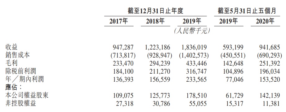 招股书显示,卓越商企服务的营业收入从2017年的9.47亿元增至2019年的18.36亿元,复合年增长率约为39.2%,截至2020年5月31日止五个月同比增加58.7%至9.42亿元;净利从2017年的1.36亿元增至2019年的2.34亿元,复合年增长率约为30.9%。截至2020年5月31日止五个月同比增加99.3%至1.54亿元。
