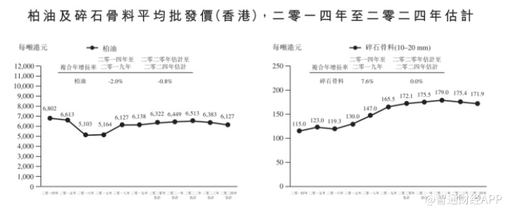 除此之外,碎石、砂砾、沙或各种回收物料均对公司成本产生影响。据Frost & Sullivan报告显示,香港柏油批发价于2014年下滑后,由2016年的5103港元/吨上涨至了2019年的6138港元/吨;碎石骨料作为生产沥青预拌料的另一种主要材料,批发价由2014年的115港元/吨升至165.5港元/吨。