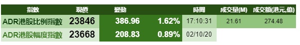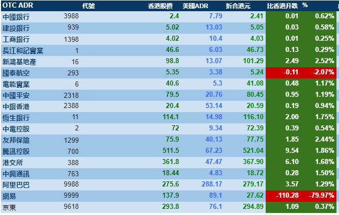 智通财经APP获悉,周五美股三大指数齐跌,港股ADR指数小幅上涨,按比例计算,收报23846点,涨386.96点或1.62%。