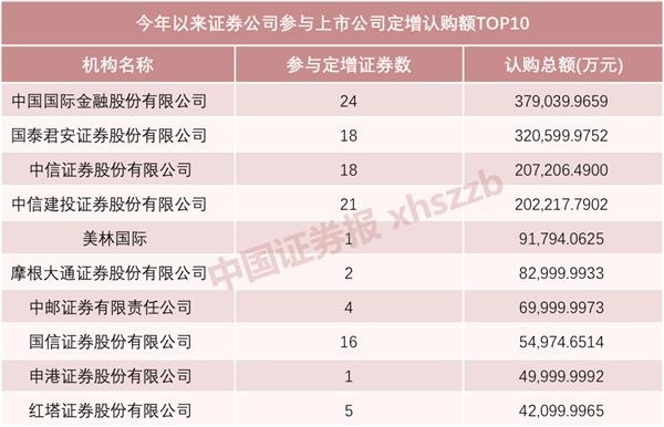 其中,中金公司(03908)参与了24家上市公司的定增,认购总额为37.9亿元;国泰君安参与了18家公司的定增,认购总额为32.06亿元。