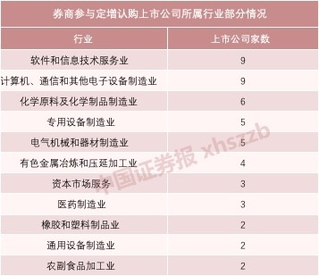 在上述券商参与的150多次上市公司定增中,涉及的上市公司数量为71家,从行业来看,计算机和软件行业的上市公司最受券商青睐。其中,计算机、通信和其他电子设备制造行业的公司数量最多,为9家;软件和信息技术服务业的公司数量同样为9家;化学原料及化学制品制造业的上市公司数量为6家。