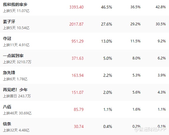 数据显示,假期首发的影片已有两部电影票房已突破10亿元大关。截至周一(5日)上午7点,总票房上,《我和我的家乡》《姜子牙》票房均超10亿元。