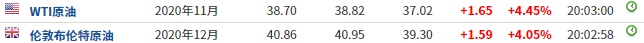 截至发稿,WTI原油涨4.45%,报38.7美元/桶。布伦特原油涨4.05%,报40.86美元/桶。