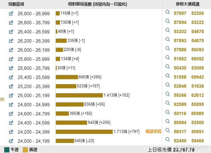 智通财经APP获悉,截至10月05日,恒指最新的牛熊街货比例53:47。摩根恒指牛熊证街货分布图中的数据显示,熊证街货重货区在24200-24399区间,该区间最新熊证数量为1713张,较上一交易日增加797张;最多新增区亦在同一区间。牛证街货重货区在22900-23099区间,该区间最新牛证数量为1636张,较上一交易日减少68张;最多新增区在23300-23499区间,该区间最新熊证数量为455张,较上一交易日增加400张。