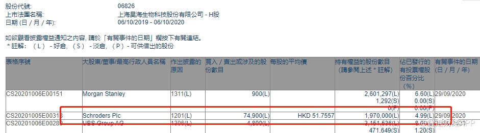 智通财经APP获悉,香港联交所最新资料显示,9月29日,Schroders减持昊海生物科技(06826)7.49万股,每股作价51.7557港元,总金额约为388万港元。减持后最新持股数目约为197万股,最新持股比例为4.99%。