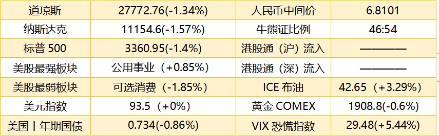1、因美国总统特朗普突然宣布,将停止刺激案谈判直至美国大选结束,导致美股尾盘急速下跌,此前三大指数曾涨约0.5%。截至美股收盘,道指收报27772.76点,跌375.88点或1.34%;标普500收报3360.95点,跌47.68点或1.4%;纳指收报11154.6点,跌177.88点或1.57%。港股ADR指数小幅上涨,按比例计算,收报24009点,涨28.83点或0.12%。
