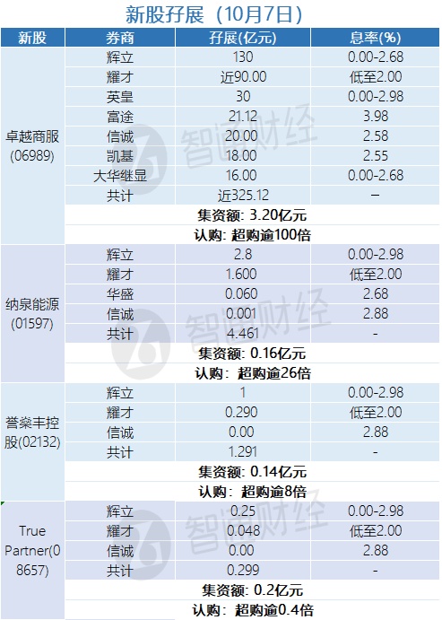 智通财经APP获悉,卓越商服(06989)、纳泉能源(01597)、誉燊丰控股(02132)和True Partner(08657)正在招股中,截至10月7日,辉立 、耀才、华盛、信诚等券商合计分别为四只股借出325.12亿港元、4.461亿港元、1.291亿港元、0.299亿港元。其中,卓越商服超购逾100倍,纳泉能源超购逾26倍,誉燊丰控股超购逾8倍。