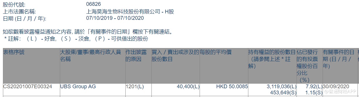 智通财经APP获悉,香港联交所最新资料显示,9月30日,UBS Group AG减持昊海生物科技(06826)4.04万股,每股作价50.0085港元,总金额约为202万港元。减持后最新持股数目约为311.9万股,最新持股比例为7.92%。