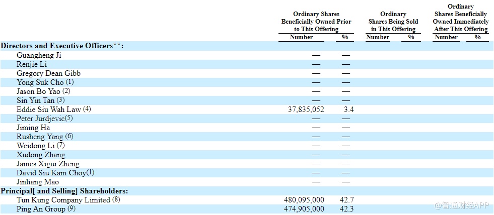 招股说明书显示,在本次IPO之前,董事Eddie Siu Wah Law持有公司3.4%股权,Tun Kung Company Limited持有42.7%股权,平安集团持有42.3%股权。
