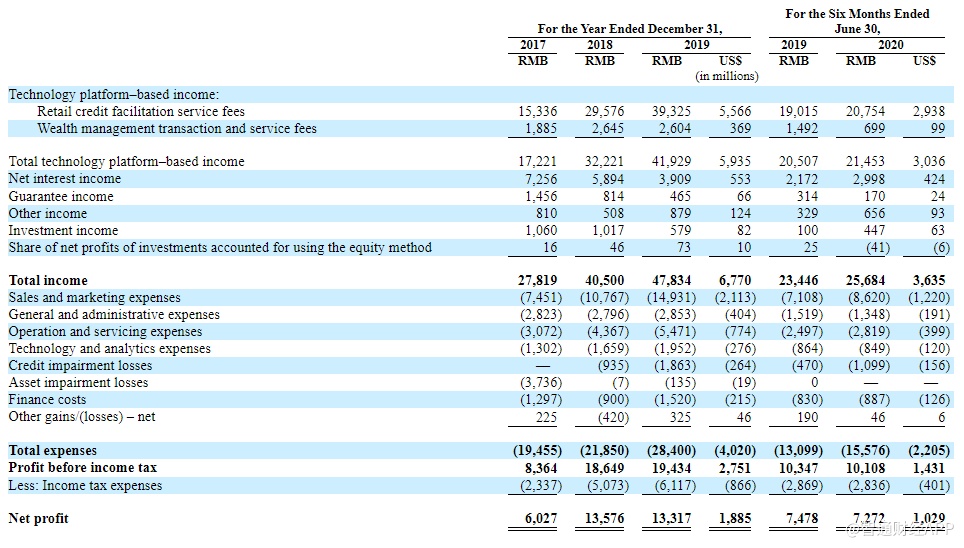 招股说明书显示,2019年陆金所收入478.34亿元,同比增长18.11%;净利润133.17亿元,同比下降1.91%。2020年前6个月,陆金所收入256.84亿元,同比增长9.5%,去年同期为234.46亿元;净利润72.72亿元,同比下降2.75%,去年同期为74.78亿元。