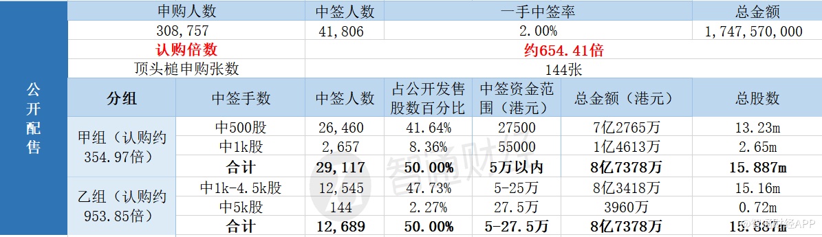 其中,公开配售申购人数308757人,一手中签率2%,认购倍数约654.41倍。