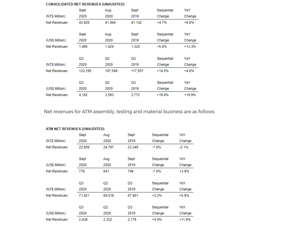 智通财经APP获悉,10月8日(周四)美股盘前,日月光半导体(ASX.US)公布2020年9月未经审计业绩。