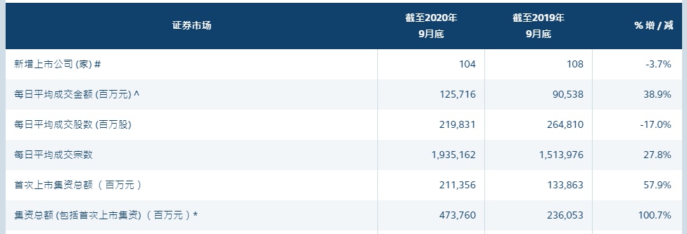 IPO方面,2020年首九个月的首次公开招股集资金额为2,114亿港元,较去年同期的1,339亿港元上升58%。2020年首九个月的总集资金额为4,738亿港元,较去年同期的2,361亿港元上升101%。