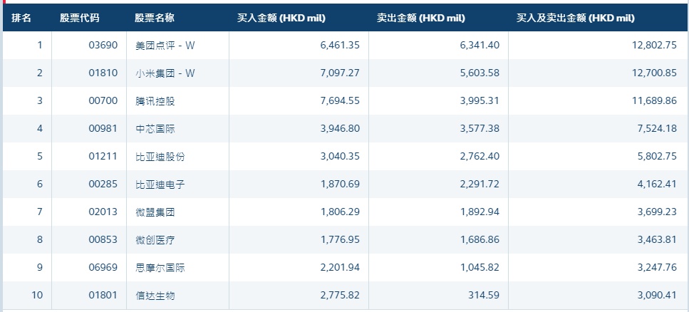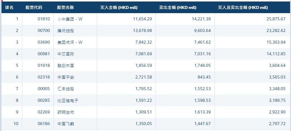 其中,沪港通南向交易十大成交活跃股分别是:小米(01810)、腾讯(00700)、美团(03690)、中芯国际(00981)、融创中国(01918)、中国平安(02318)、汇控(00005)、比亚迪电子(00285)、药明生物(02269)、中国飞鹤(06186)。