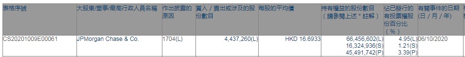 智通财经APP获悉,香港联交所最新资料显示,10月6日,摩根大通减持国药控股(01099)约443.73万股,每股作价16.6933港元,总金额约为7407.25万港元。减持后最新持股数目约为6645.66万股,最新持股比例为4.95%。
