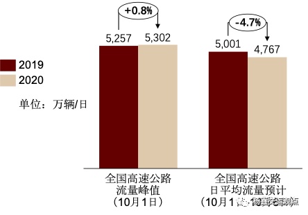 公路、铁路:高速公路车流量总体平稳。交通部预计,10月1日至8日全国高速公路日均流量4,767万辆/日[3],同比下降4.7%,其中货车流量日均同比增速达15%,我们认为或与通行效率提高与复工推进相关。同时今年车辆出行时段更为集中,今年假期全国峰值(10月1日)的车流量、拥堵距离均超历史同期。铁路客运量同比仍下滑,但较平时跌幅收窄。9月30日至10月7日,全国铁路累计发送旅客9789万人次,同比下降16.1%(今年国庆放假同比延长一天,因而未计算返程高峰、增速偏低)。该降幅相较于8月的同比下降34.4%显著收窄。
