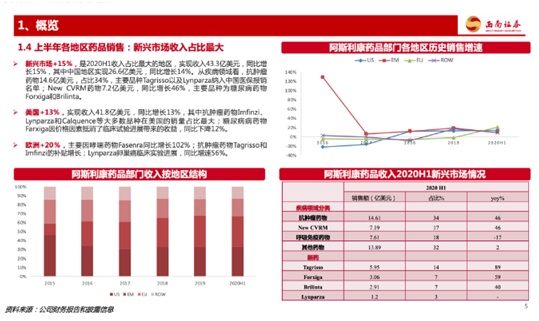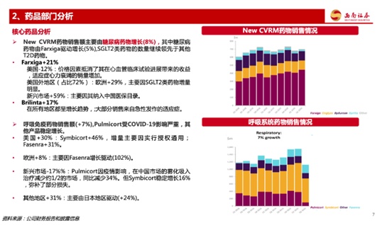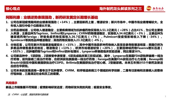 公司在公共卫生事件期间的业绩表现强劲(+14%),主要因新药上量,增速较快;新兴市场中,中国市场业绩增幅较大。全年收入指引中低个位数增长不变。