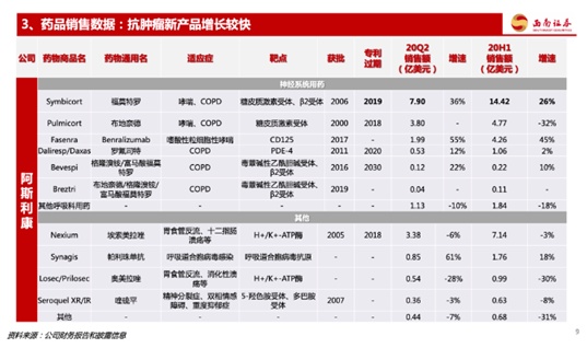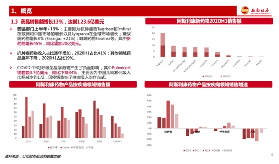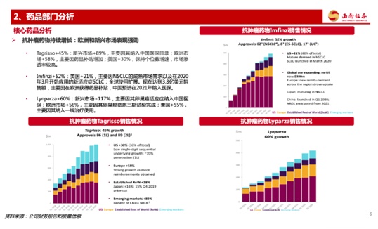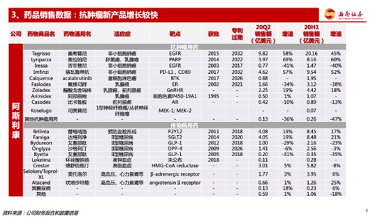分地区来看,公司在新兴市场增速幅度较大(+15%),其中中国市场因多种药物纳入医保目录导致增速明显;美国仍然为多数品种销售最多的地区,增速稳定(+13%),欧洲市场增速较快(+20%),主要因哮喘药物Fasenra增长迅速(+102%),抗肿瘤药物Tagrisso和Imfinzi的补贴增长,Lynparza卵巢癌临床实验进展,同比增速56%。