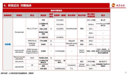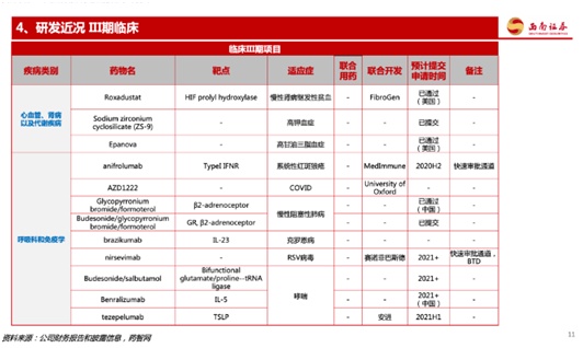 公司新品种中,5项获批,2项接受申请受理,6项完成临床第三阶段试验。其中,Lynparza在美国FDA获批卵巢癌一线治疗药物,前列腺癌二线治疗药物,在欧洲获批胰腺癌一线治疗药物;Farxiga在美国FDA获批治疗心力衰竭;Bevespi和Breztri分别在中国和美国获批治疗COPD。Brilinta在美国获批治疗冠心病、2型糖尿病。未来五年预计55个新药及新适应症在华获批。