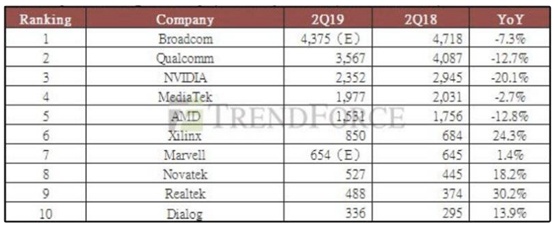 2019 年 Q2,在全球 Fableless (无晶元半导体)厂商排名中排到了第六名,只比 AMD 低了一名。