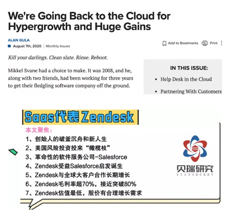 帮助云台2.0的创建者也受到Salesforce的启发,他们采用了SaaS模式,前文提及的“帮助云台”三位创始人推出了“帮助云台2.0”并将该软件和公司命名为Zendesk(ZEN.US),旨在为一团糟的客户服务带来一种完美解决方案。