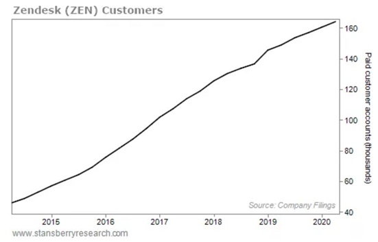 Zendesk的支持软件主要帮助企业与其客户交互沟通,并通过支持通知单和其他多项工具解决客户问题。2014年,Zendesk上市时,它总共有大约4.6万个付费账户。如今,该公司有超过164000名付费客户使用其产品系列,每年的复合增长率为24%。