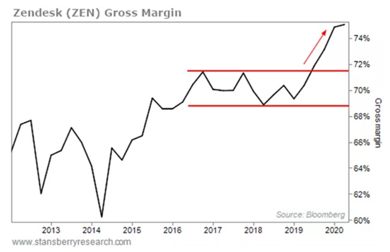 如上图,我们看到,Zendesk从2017年到2019年初的季度毛利率(毛利润占销售额的百分比)在70%左右波动。随后毛利率突破了之前的区间,在第一季度达到了近75%,这是Zendesk开始扩大规模的很明显的迹象,最近一个季度,毛利率仅略微扩大至75.1%。最终Zendesk未来将实现80%的毛利率,我们相信这是资本效率高的软件企业必须达到的。