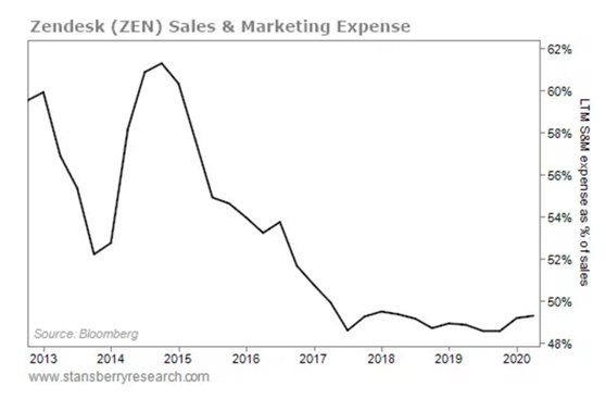如果没有卫生事件,Zendesk只需要几个季度的时间来达到。我们预期看到销售和市场营销(S&M)形成规模效益。如下图,在过去的三年里,销售费用占销售额的比例一直徘徊在49%左右。