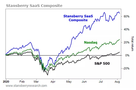 然而,SaaS股票并不仅仅是普通的科技股,贝瑞跟踪了59家“纯粹的”SaaS业务上市公司。我们设立了一个等权重的股票组合,叫做贝瑞SaaS组合。贝瑞SaaS组合复合增长率完全击垮其他行业,今年增长了惊人的64%,是纳斯达克指数22%涨幅的两倍多。