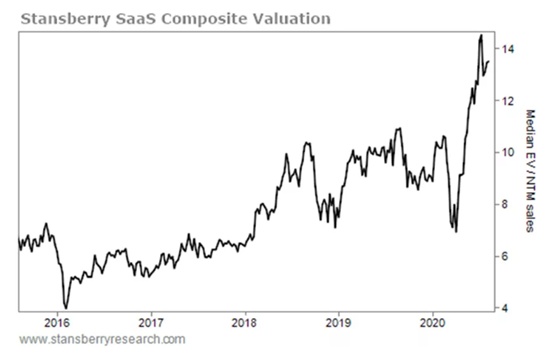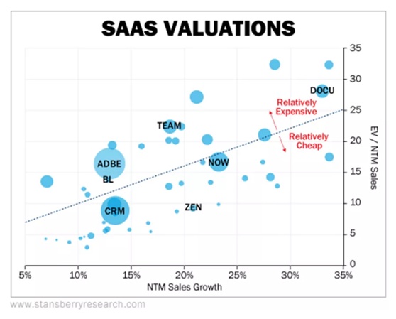 SaaS股票的一个常用估值指标是EV(EV基本上是一个公司的市值加上债务减去现金)除以NTM销售额。Adobe和Salesforce的EV/NTM销售倍数分别为15.8和8.6。上图显示了过去五年贝瑞研究的SaaS组合的估值中值。