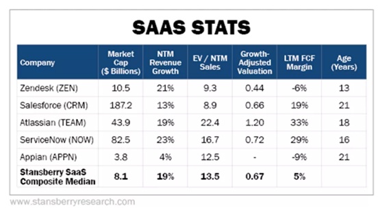 根据下表,Zendesk的增长调整后估值为0.44,把它看作是你为每一个百分点的增长所付出的代价,那当然是越低的更好。Atlassian经过增长调整后的估值为1.2,非常昂贵。尽管它确实有突出的自由现金流利润。