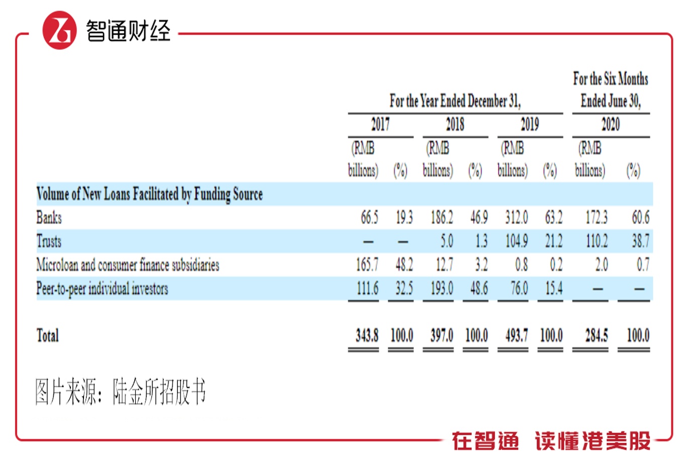 该公司目前资金来源均为机构,于2020年上半年已彻底退出P2P业务,期间和49家银行合作,国家股份制银行,城市商业银行,农村商业银行和区域银行等,同时也和信托基金合作。上半年,新增贷款中,有60.6%的资金来自于银行,有38.7%的资金来自于信托,合计达99.3%。