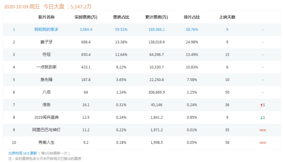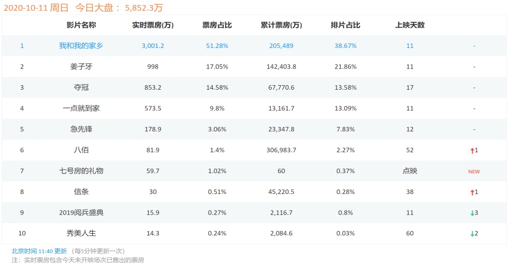 节后,上述三大重磅电影票房继续攀升,截至10月9日16时,《我和我的家乡》上映9天累计实现票房19.94亿元、《姜子牙》上映9天累计实现票房13.8亿元,《夺冠》上映15天累计实现票房达到6.44亿元。截至10月11日,《我和我的家乡》更是成为2020年国庆档首部突破20 亿票房的电影。