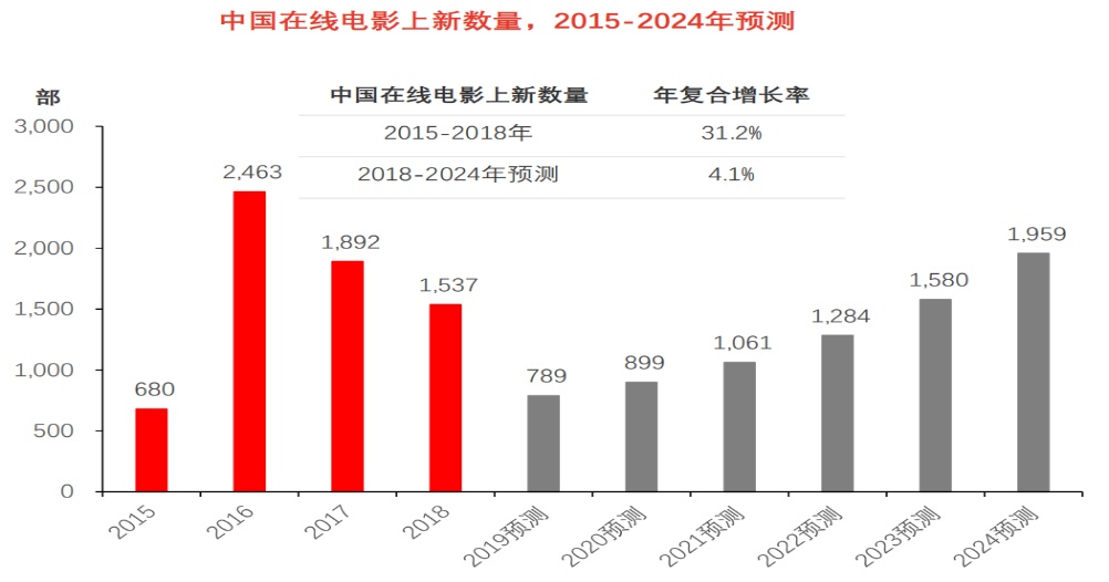 网络电影市场经历爆发性增长后趋于冷静,2019年整体上线量同比下降49%,但播放表现仍稳步提升,全年累计正片播放同比提升24%。随着市场逐步冷静与行业逐步正规,经过六年发展的网络电影将迎来优胜劣汰的U形反转。据头豹研究院预测,2020年中国在线电影上新数量将重拾升势,预计全年上新数量将接近900部,到2024年将达到近1960部,超过2017年水平。