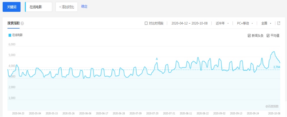 根据百度搜索指数数据,在线电影搜索指数在2019年迎来一个大高潮,随后出现2020年6月开始重拾升势,在国庆节期间达到一个小高潮。