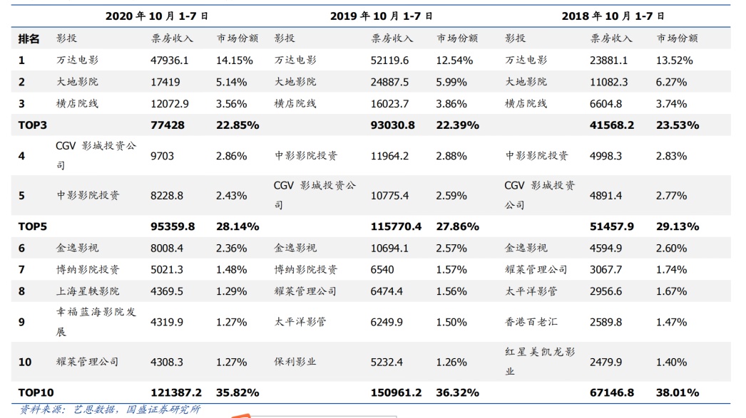 据艺恩数据,2020年1月至7月,前3大院线票房收入市占率达到32.18%,同比提升1.5个百分点,前5大院线市场份额提升1.74个百分点至46.24%,前7个月万达电影的市场份额达到14.65%同比提升近1.7个百分点。2020年10月1日至7日,前5大院线市场份额提升约0.3个百分点至28.14%,其中万达电影的份额提升近1.6个百分点至14.15%。