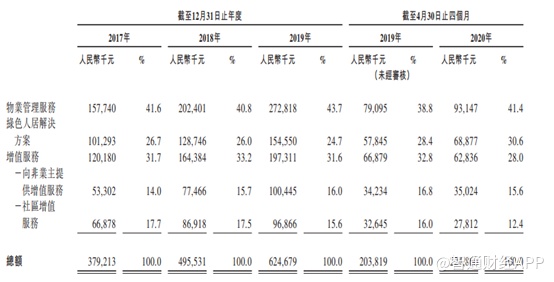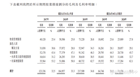 三大业务中,物业管理服务占比最高,2017-2019年,第一服务的物业管理服务收入分别为1.58亿元、2.02亿元以及2.73亿元,占比41.6%、40.8%以及38.8%。截至2020年4月30日,物业管理服务收入9314.7万元,占比41.4%。而绿色人居解决方案和增值服务两大业务占总营收上基本上平分秋色,但是从公司近几年的占比来看,绿色人居解决方案要好于增值服务,近年来,绿色人居解决方案营收占比逐步提升,从2017年的26.7%提升至2020年4月30日的30.6%,而增值服务收入却从2017年的31.7%逐步下降至2020年4月30日的28%。