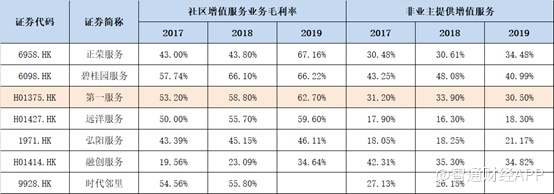分业务来看,第一服务各大业务毛利率基本上都处于行业中上水平。具体来看,公司毛利率最高的业务为增值服务,不难发现,无论是毛利率还是毛利总额,增值服务均领先于其他两项业务,并对第一服务的盈利能力起到明显的提振作用。最新一期数据显示,第一服务的增值业务毛利率高达45.7%,毛利合计2873万元。而增值业务中又属社区增值服务业务毛利率最高,最新一期毛利率高达62.1%。从自身各大业务来看,第一服务的社区增值服务毛利率极高,但与同行相比,该水平也仅处于中上水平而已。
