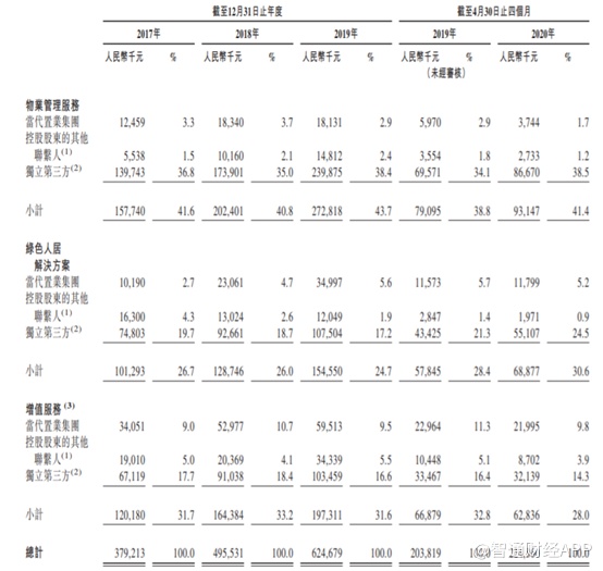 从招股书来看,按客户类型分类,第一服务来自独立第三方收入占比很高,截至2020年4月30日,来自独立第三方的收入合计占总收入的77.3%。独立第三方收入占比如此之高,不知道的人以为是第三方物业招标能力非常强。然而事实并非如此,在第一服务招股书中,独立第三方包括当代置业开发的项目的住户和业主以及第三方开发商开发的项目的住户和业主,而并非表示该项目是第三方开发商开发的项目,也就是说第一服务招标能力并不强。